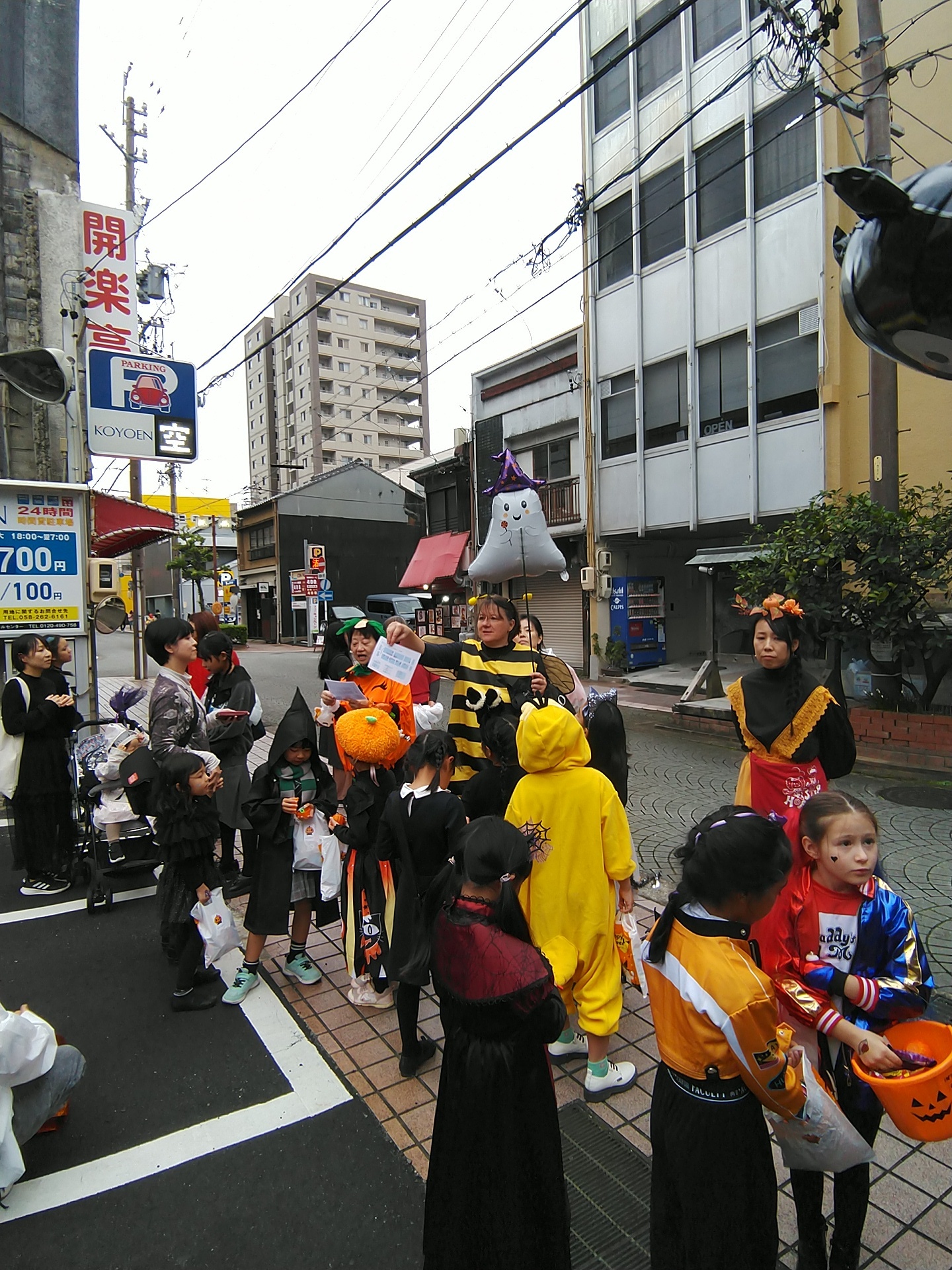 ![]() 第1グループはLeonora先生のWitchグループです岩田屋豆腐店さんが最初の"Trick or Treat"ポイントです |
