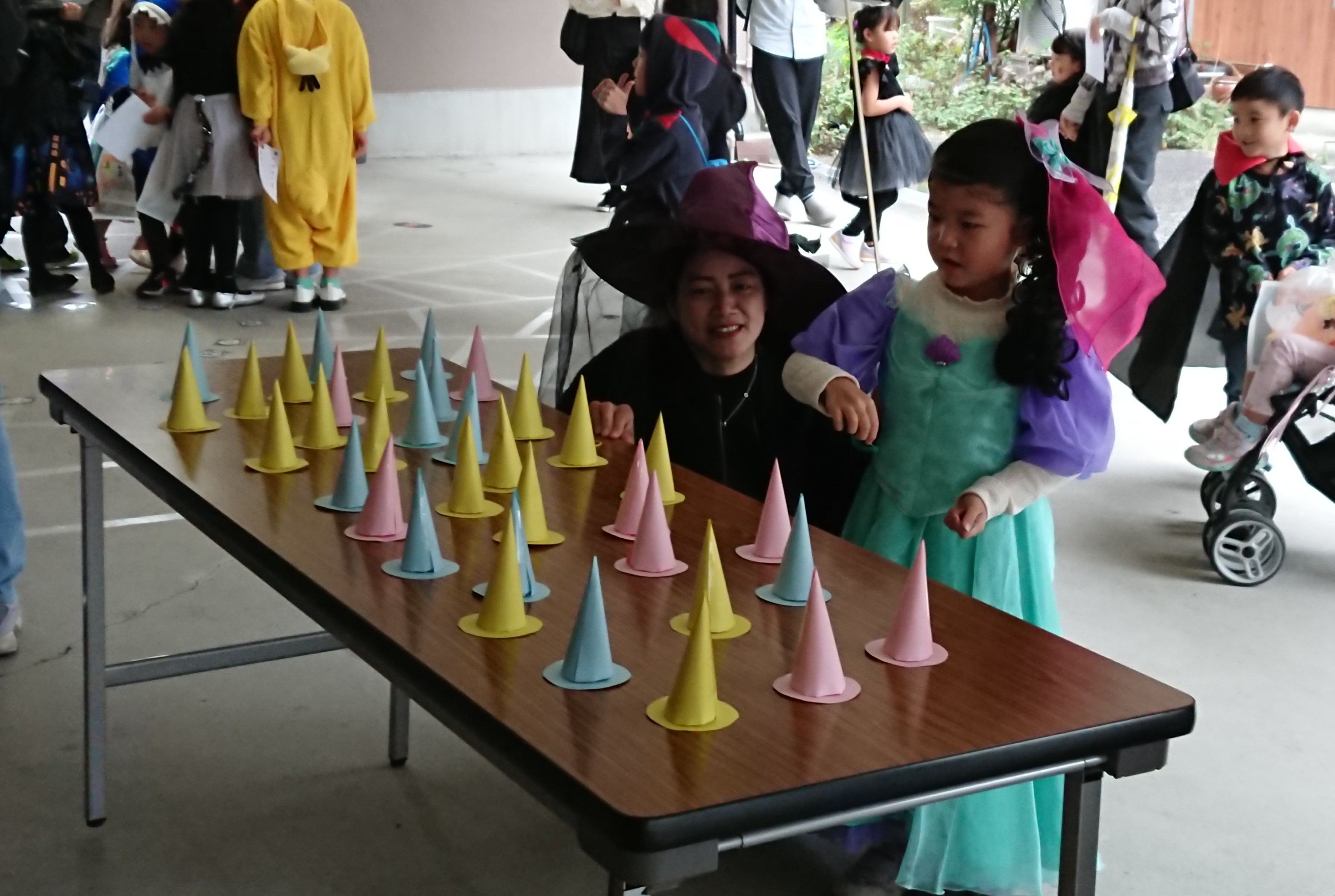 今回はプラスティック製のジャックオランタンの中にお菓子を詰め、それを口でくわえるゲームにアレンジして行いました。