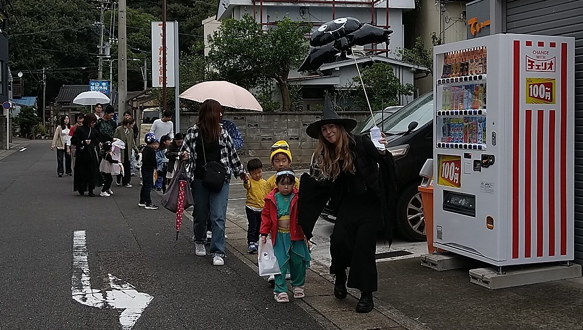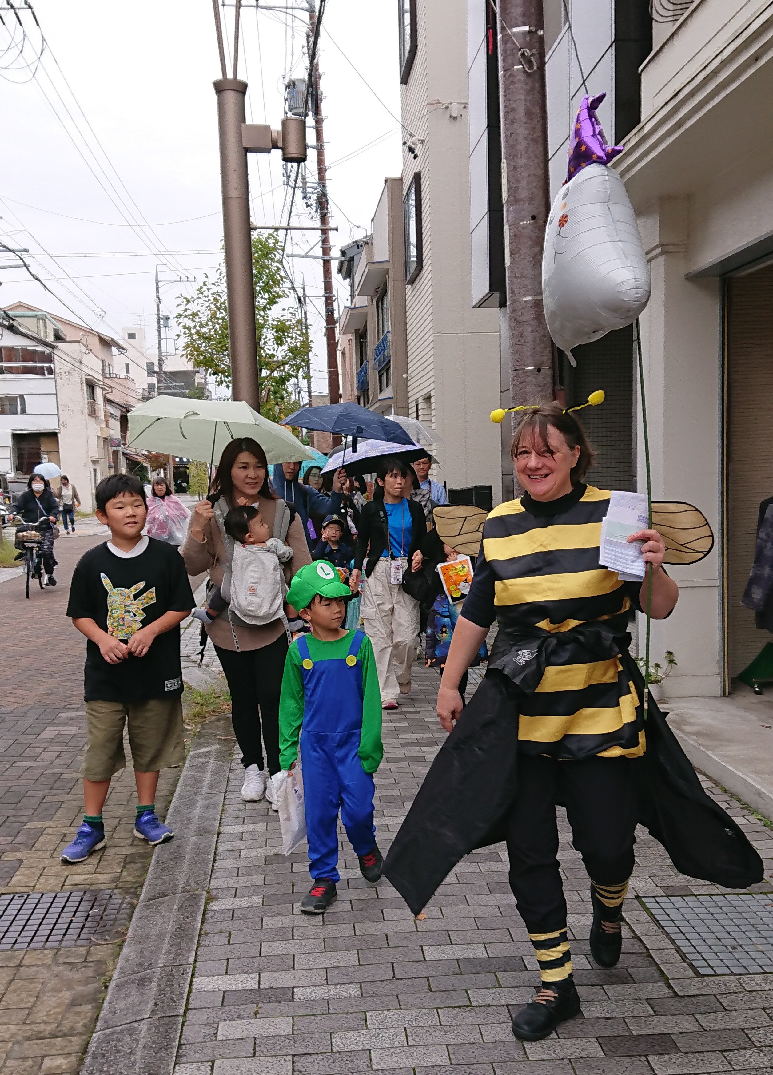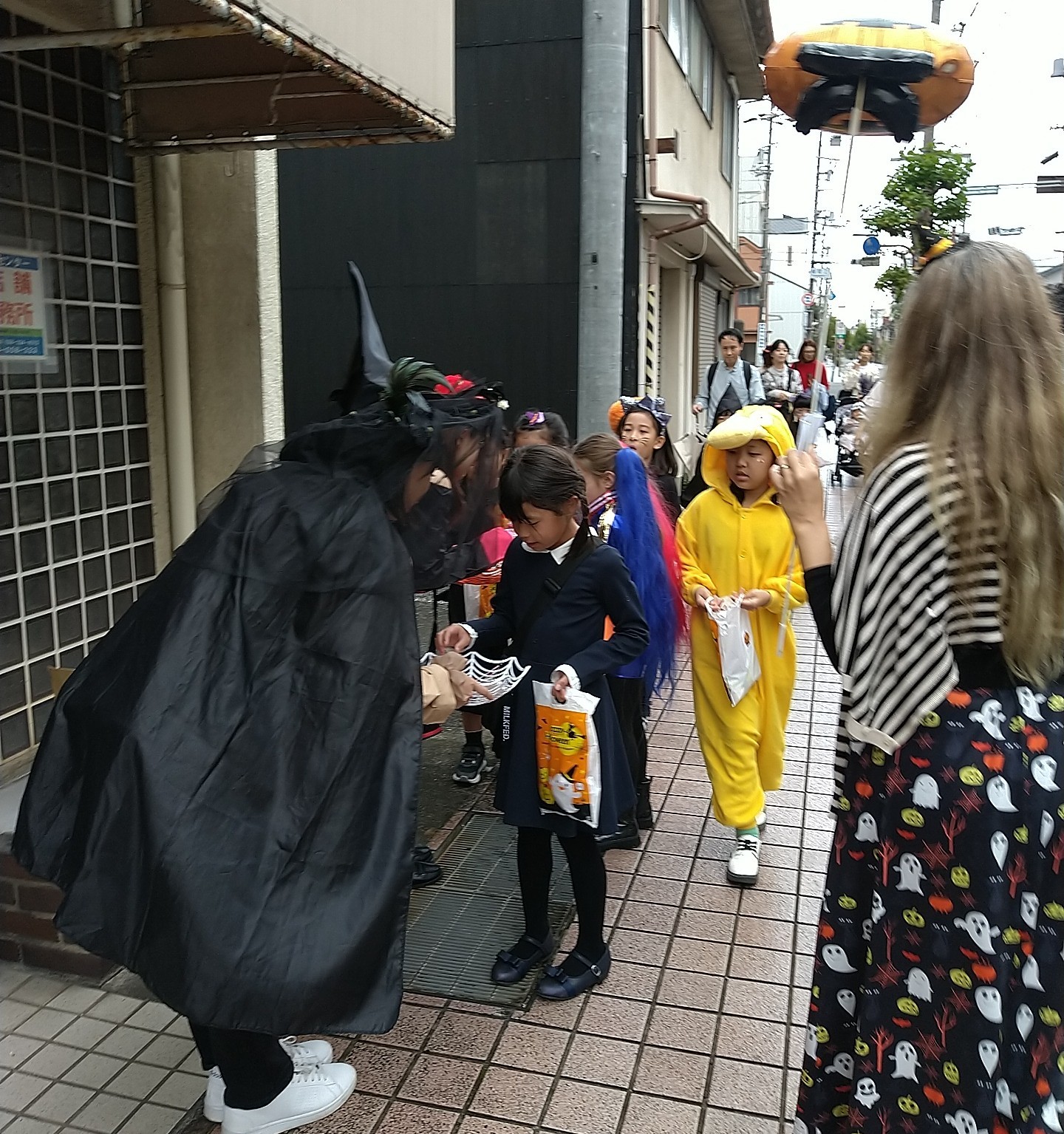 ![]() 第1グループはLeonora先生のWitchグループです岩田屋豆腐店さんが最初の"Trick or Treat"ポイントです |