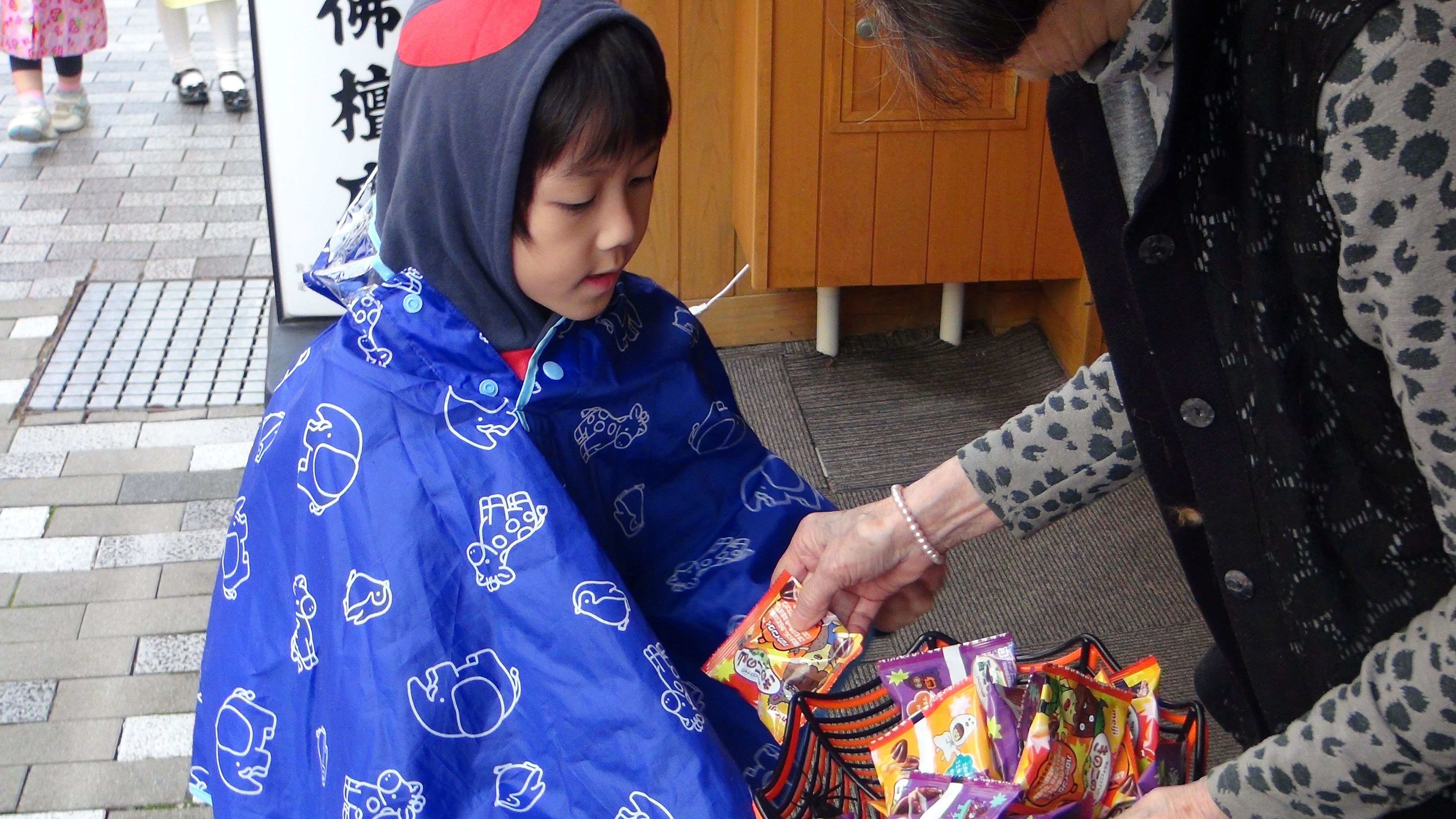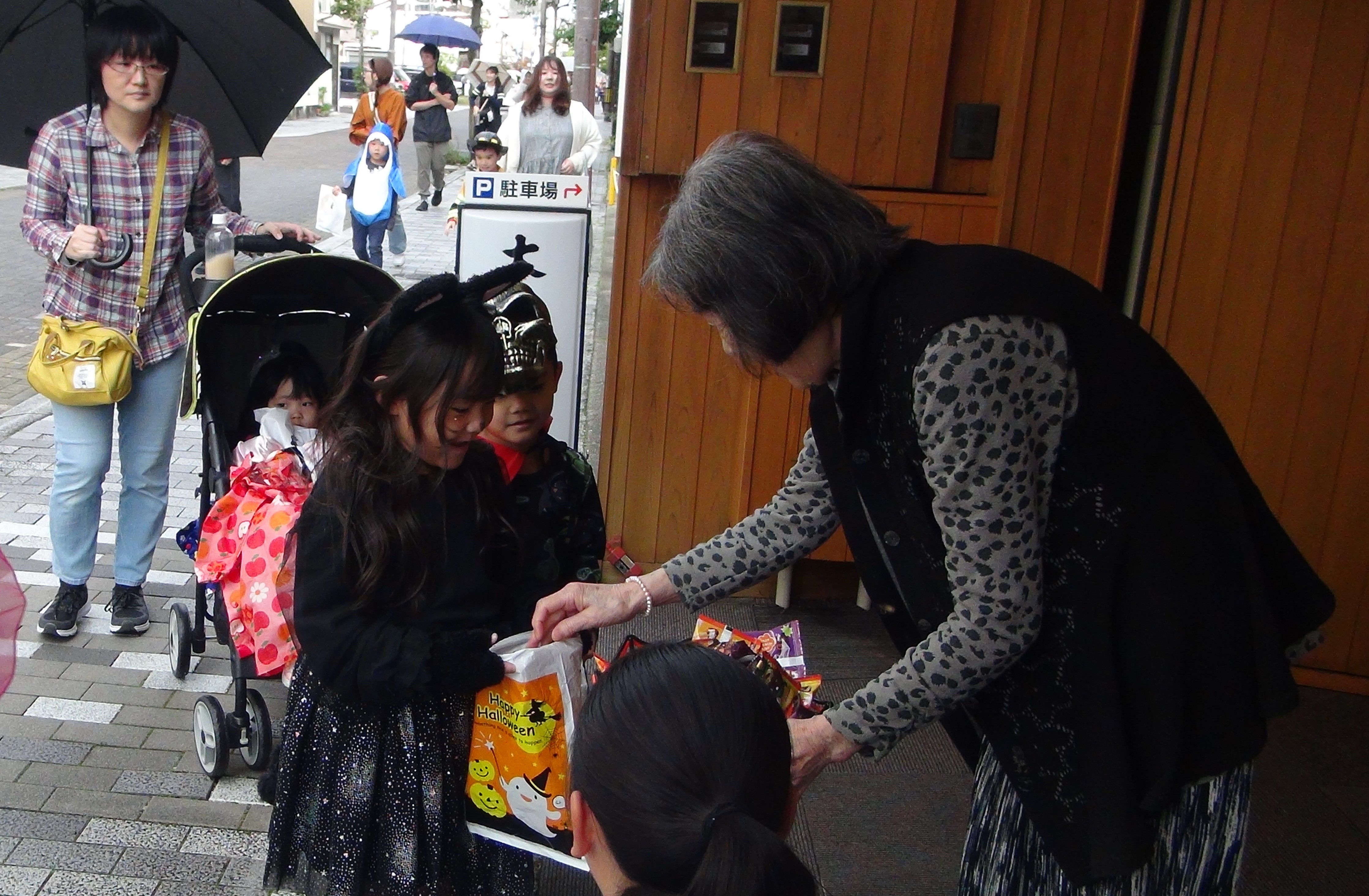 美殿町と殿町では、商店街の協力により各商店にお菓子を用意してもらい「トリックオアトリート」と言って訪れる子供に配布していました。